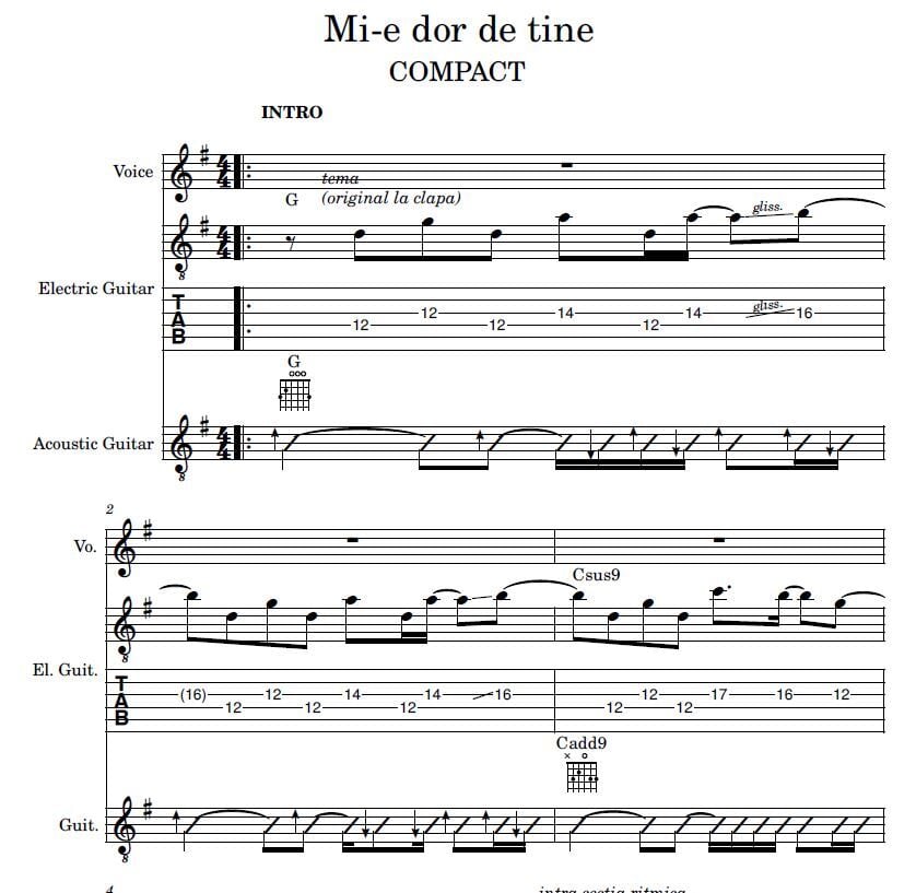 PDF-ul suport al tuturialului cu acelasi nume. Cuprinde linia melodica+ versuri, 2 chitare, armoniile de la chitara de acompaniament, partea de solo-tema de pe partea introductiva precum si cifrajele si diagramele acordurilor. Aranjamentul chitarei este personal (ritmul - "bataia" de la chitara acustica - nu exista pe inregistrarea originala, dar este facut special pentru a putea fi cantat usor la nivel de amatori)