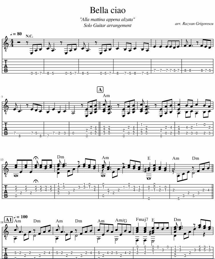 This is my classical guitar arrangement of the popular song "Bella ciao". This version is as played by me on Guitar Chords Galaxy Youtube channel. It has both the SCORE and TAB versions